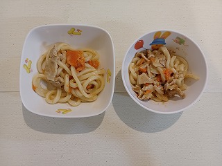 おやつは、焼うどんです。肉も野菜もたっぷりでおいしそうですね(*^-^*)