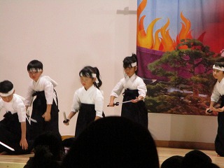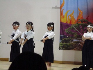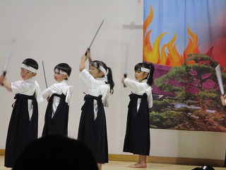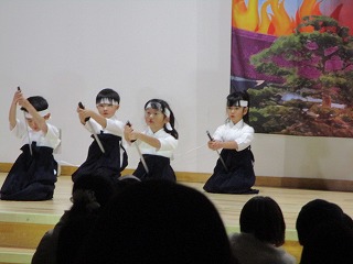 今日は、剣舞 白虎隊の発表をご紹介しますね。この剣舞は、園の伝統の舞です。発表会以外にも地域の行事で披露しています。卒園児は懐かしさを感じたり、地域の皆様には、園児の凛々しい姿に感動の声をいただいたりしています。