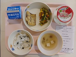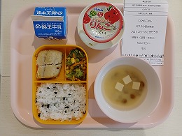今日の給食は、わかめごはん・サワラの西京焼き・ブロッコリーのごまサラダ・味噌汁(豆腐・なめこ)・りんごゼリー・牛乳です。