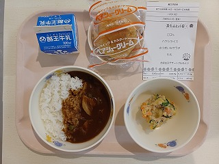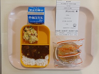 今日の給食は、ハヤシライス、さつまいもサラダ、お誕生会デザート(シュークリーム)、牛乳です。