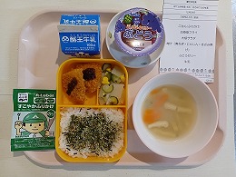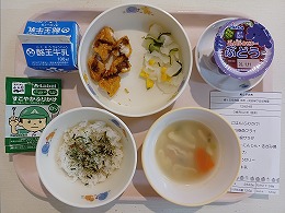 今日の給食は、ごはん(ふりかけ)・白身魚フライ・大根サラダ・味噌汁(青ねぎ・にんじん・きざみ揚げ)・ぶどうゼリー・牛乳です。