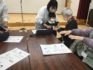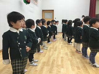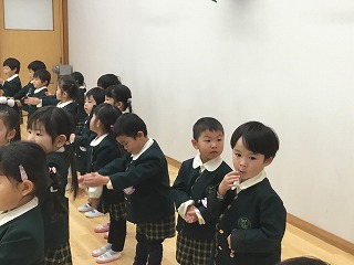 12月上旬に、あやめ組のお友達は幼稚園のお友達と一緒に、公民館にお出かけしました。公民館では、地域のおじいさん、おばあさん方のサロンにお招きをいただきました。