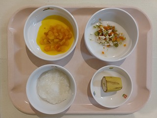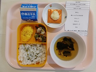 さて、今日の給食は、菜飯、鶏といんげんの炒め物、オムレツ、すまし汁、型抜きチーズ、牛乳です。