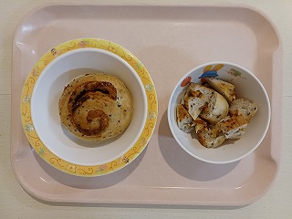 おやつは、おいしそうなパンですね。ごまきなこパンです。おなかいっぱいになっちゃうね😊