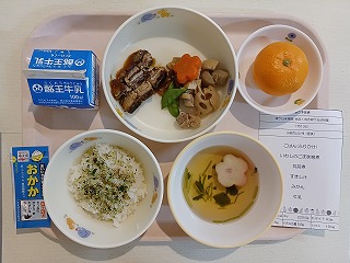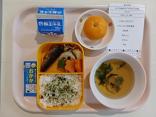 今日の給食は、ごはん、ふりかけ、イワシのゴマ味噌煮、筑前煮、すまし汁、みかん、牛乳です