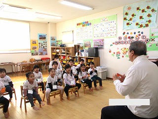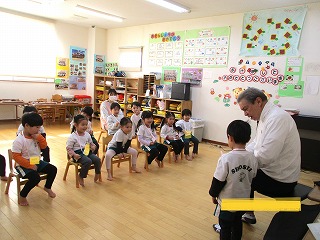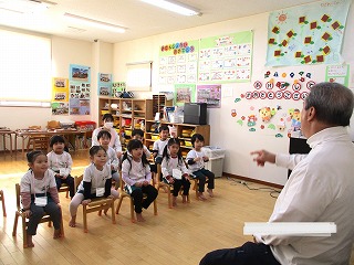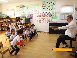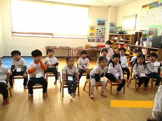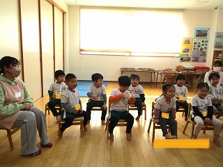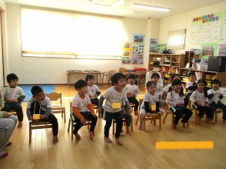 英会話の先生は、ニコニコして子どもたちに英語で話しかけます。先生の行動と言葉の違いは、何かな・・・じっと見て、聞いているお友達がたくさんいますよ。