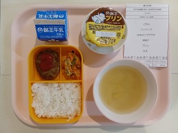 今日の給食は、ごはん、ハンバーグ、白菜のツナサラダ、味噌汁(じゃがいも・きざみ揚げ)、プリンです。おやつは、2~5歳児さんはチョコバナナと煎餅、0,1歳児さんはバナナと煎餅です。