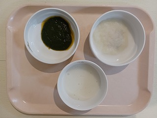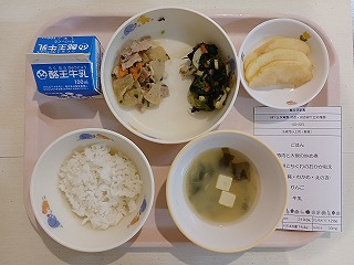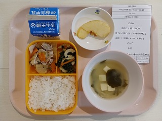 さて給食は、ごはん、大根と豚肉の炒め煮、ほうれん草とちくわのおかか和え、みそ汁、リンゴ、牛乳です。