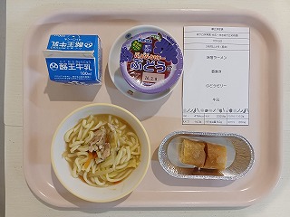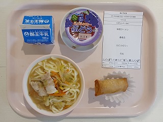 おなかがペコペコのお友達に、おいしい給食が準備されていますよ。今日は、味噌ラーメン、春巻き、牛乳、ぶどうゼリーですよ。ラーメンには、お野菜もいっぱい入ってます!