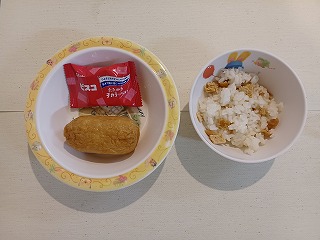 おやつは、お稲荷さんとお菓子です。小さい組さんは、油揚げが小さくカットされてますよ。食べやすくなるように、給食の先生の愛情です♡
