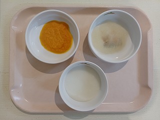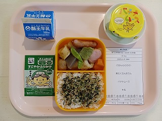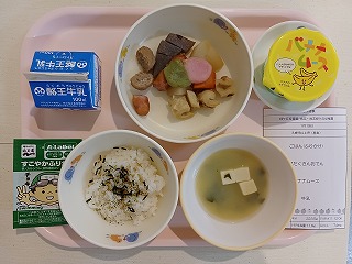 今日の給食は、ごはん、ふりかけ、具沢山おでん、バナナムース、牛乳です。おいしそー(*^-^*)