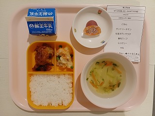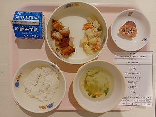 今日の給食は、ごはん、タンドリーチキン、和風ポテトサラダ、春雨スープ、ミニゼリー、牛乳です。和風ポテトサラダは、マヨネーズ、めんつゆ、塩で味をつけてくれているそうです(*’▽’)