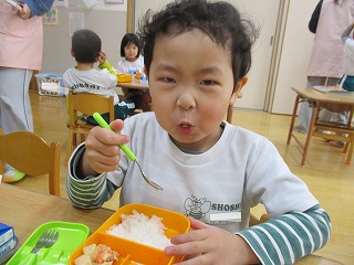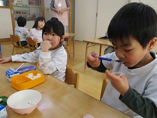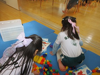 午前中は学年に合わせた活動の時間となりますが、朝や給食後は3学年の異年齢児で過ごしています。その中で、大きい組のお友達が手本になる『おぎょうぎのよい子』の姿、困っている子に声をかけてくれる『しんせつな子』の姿、自分で決めた目標まで頑張る『がまんする子』の姿から、小さい組のお友達は、『○○ちゃん(くん)、だいすき』とあこがれを持つようになりました。