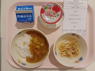 今日の給食は、オリジナルカレー、和風スパゲティ、リンゴゼリー、牛乳です。