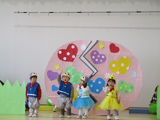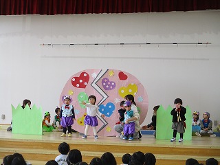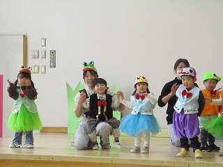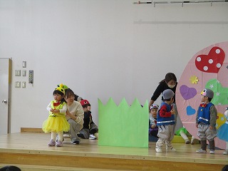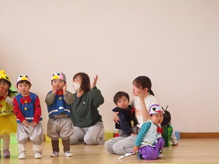 先生やお客さんの大きい組のお兄さん、お姉さんの『でておいで~』の合言葉で、登場です!