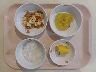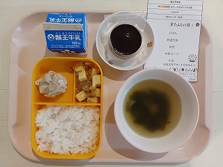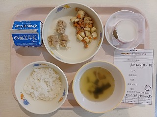 さて今日の給食は、ごはん、麻婆豆腐、シュウマイ、中華スープ、牛乳、特別デザートです。