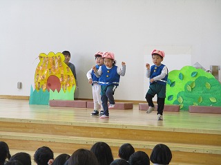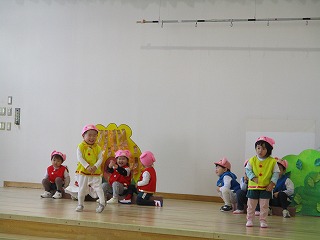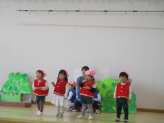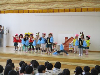 ちゅうりっぷ組の発表会『三匹のこぶた』の衣装を着けて、ステージ練習がありました。かわいい衣装を身に着けて、いつもより役になりきっているようです。おおかみ役のお友達は、フェイクファーのベストもステキです(*^-^*)