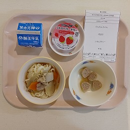 今日の給食は、けんちんうどん・肉団子・いちごゼリー・牛乳です。