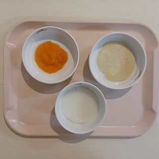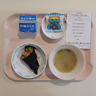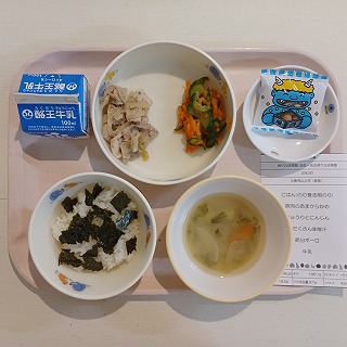 さて、今日の給食は、3~5歳児クラスは恵方巻ですよ。豚肉の甘辛炒め、キュウリと人参をのりにくるんで食べましょうね。自分で恵方巻作れたかしら・・・そのほか、具沢山みそ汁、節分ボーロ、牛乳です。