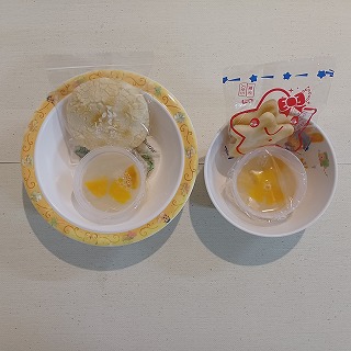 おやつは、手作りゼリー、せんべいです。さっぱり味でおいしいよね。