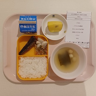 さて、今日の給食はごはん、イワシの甘露煮、里芋のそぼろ餡、みそ汁、バナナ、牛乳です。