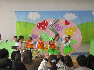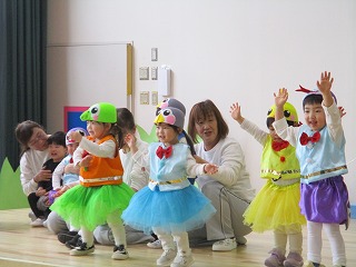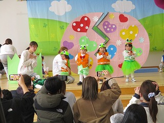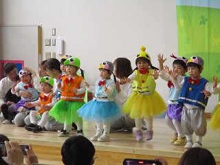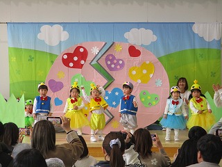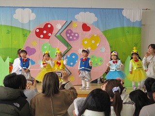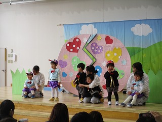 1歳クラス たんぽぽ組のお友達の発表会がありました。手遊びうた、ダンスの『たまごのあかちゃん』の発表です。ホールにはたくさんのママ、パパ、ご家族の皆様が応援してますよ(*^-^*)