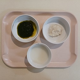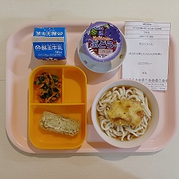 今日の給食は、天ぷらうどん・ほうれん草とにんじんのお浸し・ぶどうゼリー・牛乳です。