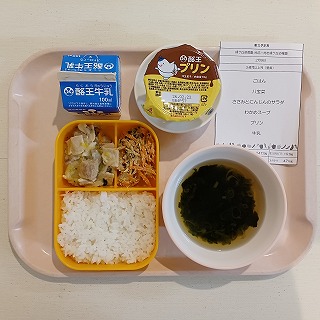 今日の給食は、ごはん、八宝菜、ささみと人参のサラダ、わかめスープ、プリン、牛乳です。