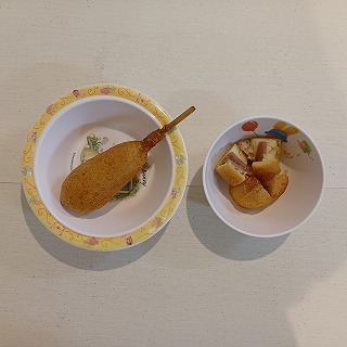 おやつは、アメリカンドックです。お部屋でケチャップもつけますよ(*^-^*)おいしそうね