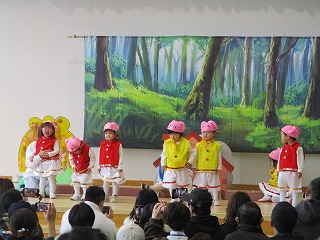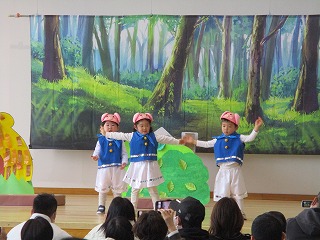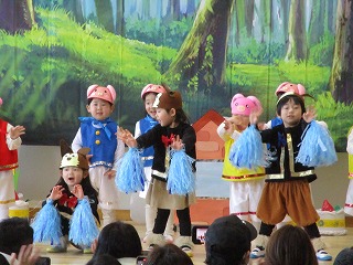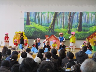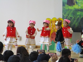 先週、ちゅうりっぷ組のオペレッタ『さんびきのこぶた』の発表会でした。練習の時は、ステージの上でもみんな楽しく踊っていました。発表会当日は、大好きなママ、パパ、おじいちゃん、おばあちゃんたちが大勢見にきてくれました。みんな緊張しないでできるかな・・・はじまり~