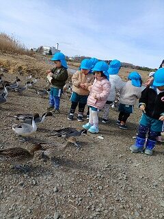 白鳥と鴨がたくさんいましたね。鴨たちは、子どもたちのそばまで餌を求めてやってきました!