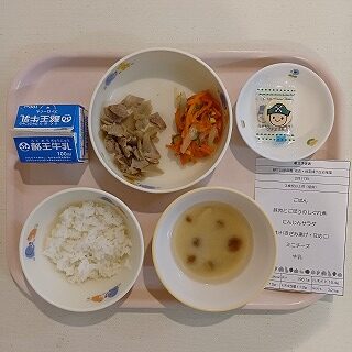 さて今日の給食は、ごはん、豚肉とごぼうのしぐれ煮、にんじんサラダ、みそ汁、ミニチーズ、牛乳です。しぐれ煮は新メニューです。ごぼうの香りと豚肉のうまみ合わさった、栄養たっぷりのおかずです(*’▽’)