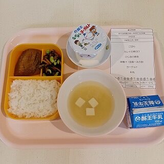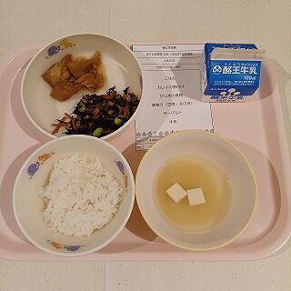 さて今日の給食は、ごはん、カレイの煮つけ、ひじきの煮物、みそ汁、ヨーグルト、牛乳です。