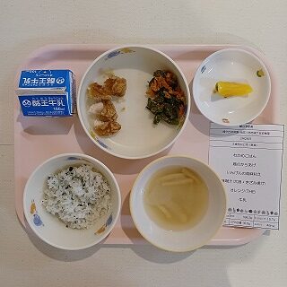 今日の給食は、わかめごはん、鶏のからあげ、いんげんの胡麻和え、みそ汁、オレンジ、牛乳です。卒園式の練習をがんばったさくら組さんに、今日の給食メニューを伝えると、『やったー!』と大歓声だったようです。今日も、ピッカピカの完食だったかな。