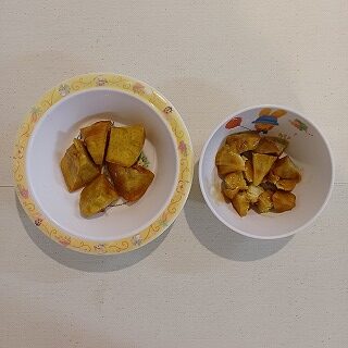 おやつは、おいしいメニューの大学イモです。さつまいもの甘みを楽しめる大学芋です。食物繊維が豊富で、おなかの調子を整えてくれます。