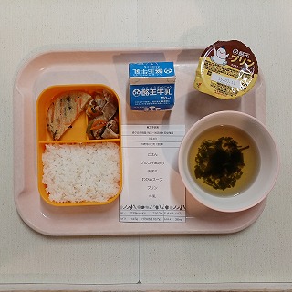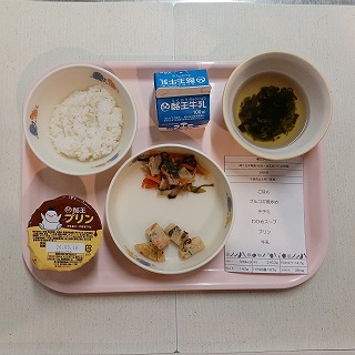 さて、おなかペコペコのお友達、給食はごはん、プルコギ風炒め、チヂミ、わかめスープ、プリン、牛乳です。