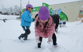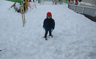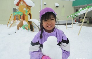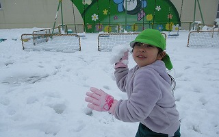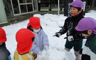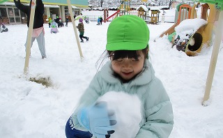 真っ白な園庭に飛び出していった子どもたちです。ぎゅっ、ぎゅっと雪玉をつくったり、ブーツの丈を気にせず、ズボッと雪に足を入れたり・・・おおはしゃぎです(*^-^*)