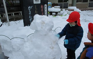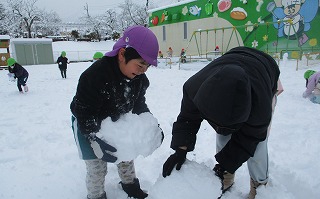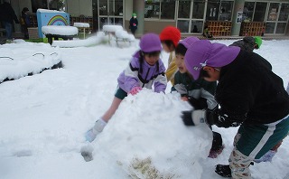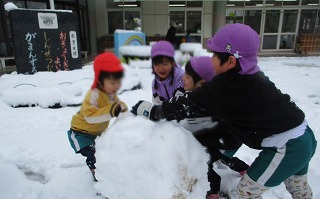 力を合わせて大きな雪だるまを作りあげる子どもたち、毎日の生活で互いに助け合うことで自然に協力しあう心が成長されていると感動です(*’▽’)