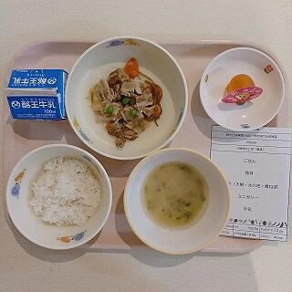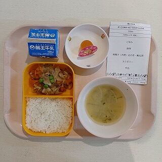 さて今日の給食は、ごはん、豚丼、みそ汁、ミニゼリー、牛乳です。ボリュームたっぷりですね