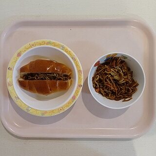 おやつは、焼きそばパン(小さい組はやきそば)です。ある子の連絡帳に『大好きなやきそばパンを楽しみにしています』と、コメントがありました(*’▽’)