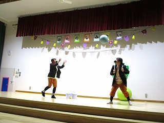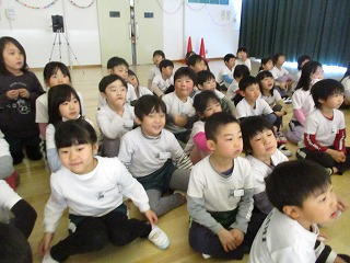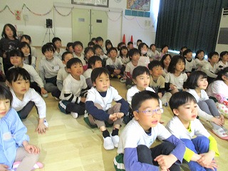 今月に保育園を卒園するさくら組と幼稚園を卒園するお友達と一緒に『おたのしみ会』がありました。ホールからにぎやかな声が聞こえてきましたよ。