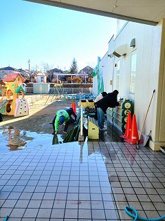 奉仕活動で園舎ピカピカ、3/16給食、おやつ