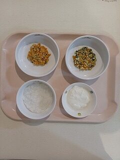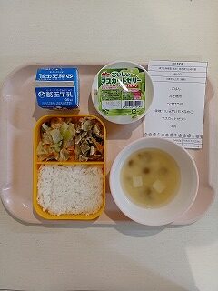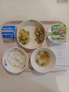 さて今日の給食は、ごはん、みそ焼肉、ツナサラダ、みそ汁、マスカットゼリー、牛乳です。