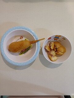 おやつは、アメリカンドックです。ソーセージが入って大人気のおやつです。