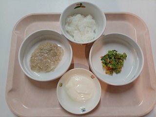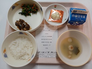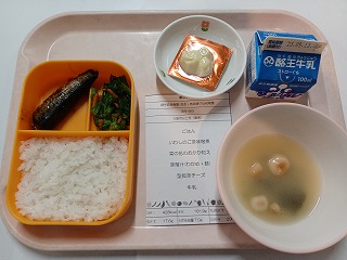 さて今日の給食は、ごはん、イワシの胡麻味噌、菜の花のおかか和え、みそ汁、型抜きチーズ、牛乳です。