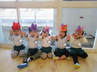 さくら組、ひまわり組、あやめ組で2階保育室で生活を送っています。 午前中は学年に合わせた活動の時間となりますが、朝や給食後は3学年の異年齢児で過ごしています。その中で、大きい組のお友達が手本になる『おぎょうぎのよい子』の姿、困っている子に声をかけてくれる『しんせつな子』の姿、自分で決めた目標まで頑張る『がまんする子』の姿から、小さい組のお友達は、『