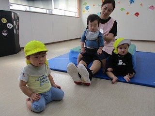 つぼみ組は、赤ちゃんクラスですが、4月生まれのお友達は、1歳半になり、よちよち歩きも大変上手になりました。また、ハイハイのお子さん、お座りができるようになったお子さんなど成長をみて、一人一人に合わせて、保育をしています。 今日は、プレイルームでお遊びです。すべり台、トランポリンなど用意して、あそびましょ! 10月入園のお友達もいますよ。今日は、先生
