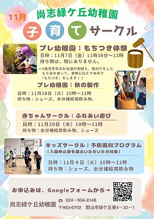 11月 プレ幼稚園・赤ちゃんサークルのご案内です。 ぜひ、園に遊びにきてください。 入園説明会ご希望の方も問い合わせください。 申し込みは、Googleフォーム 尚志緑ケ丘幼稚園→https://forms.gle/U8tKhMJYhvp4oPc48 尚志幼稚園→https://forms.gle/KqZKFa5Wy8XbXxhf6 お願いします。