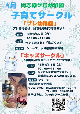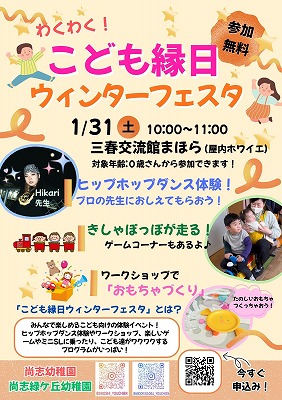 1月 『こども縁日~ウィンターフェスタ』のご案内です。 ぜひ、『三春交流館まほら』にて行います。ぜひ遊びにきてください。 入園説明会ご希望の方も問い合わせください。 申し込みは、Googleフォーム 尚志緑ケ丘幼稚園→https://forms.gle/U8tKhMJYhvp4oPc48 尚志幼稚園→https://forms.gle/KqZKFa